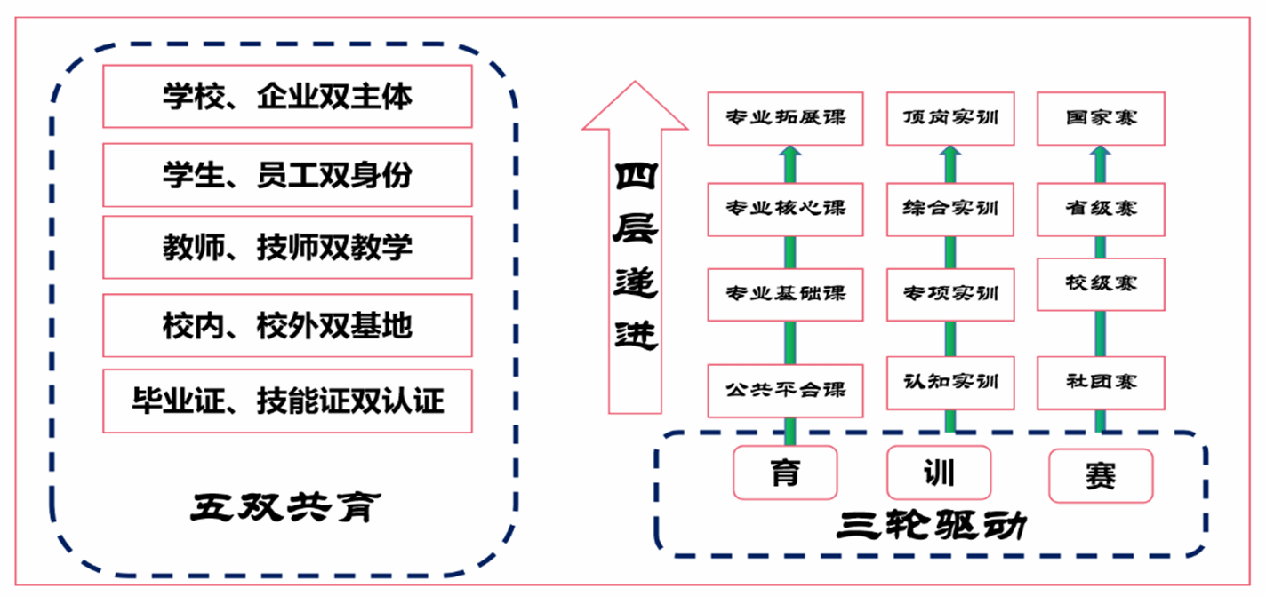 图1. “五双共育、四层递进、三轮驱动”人才培养模式