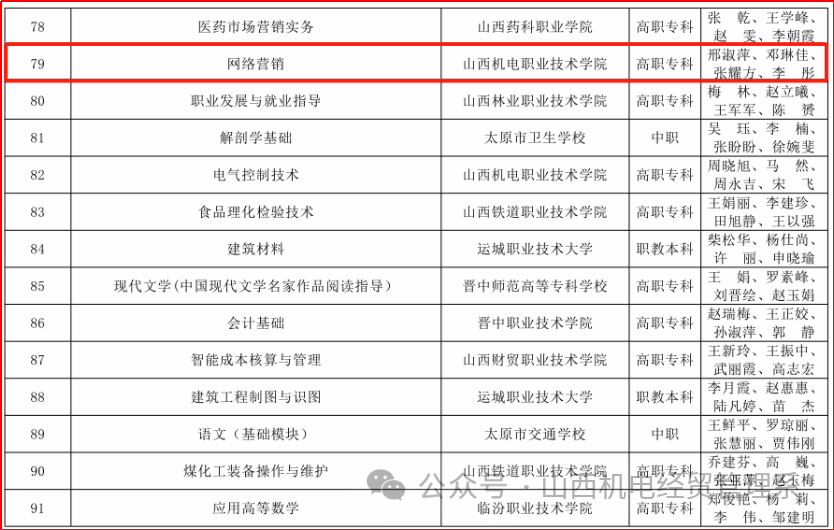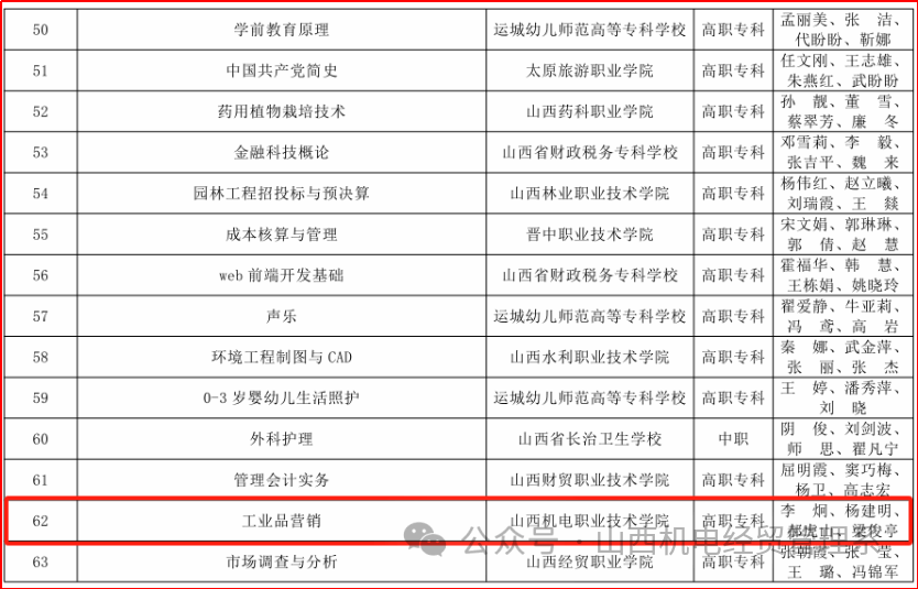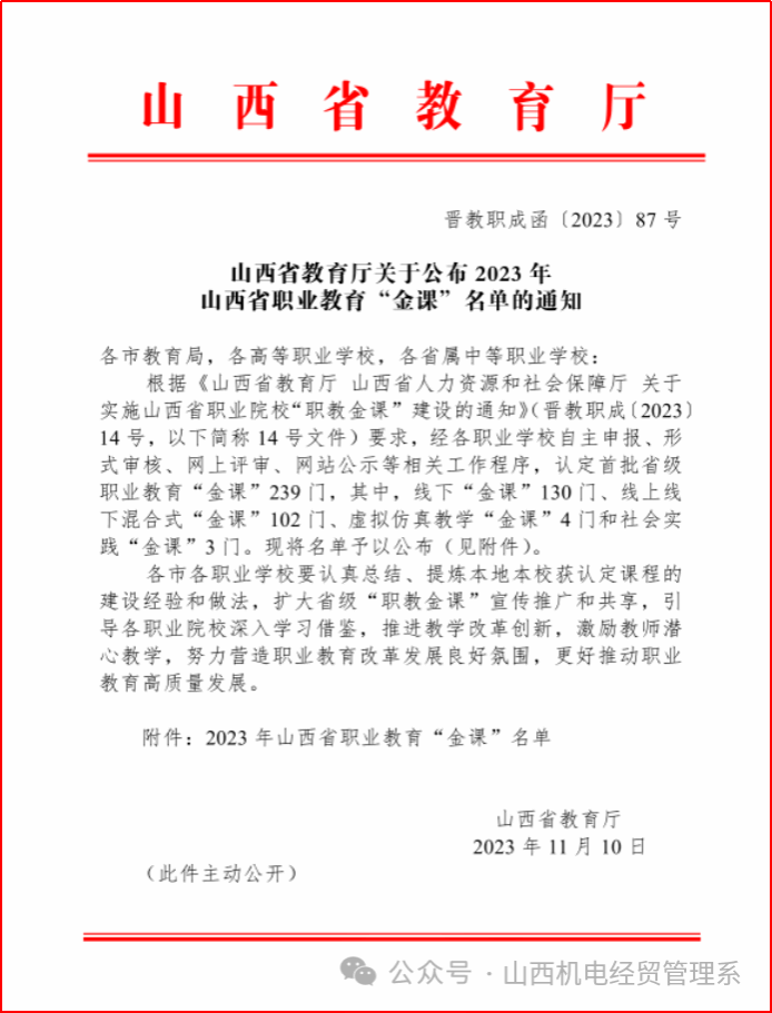 经自主申报、形式审核、网上评审、网站公示等相关工作程序,经贸管理系李炯老师负责的“工业品营销”课程、邢淑萍副主任负责的“网络营销”课程入选了2023年山西省职业教育线上线下混合式“金课”名单。