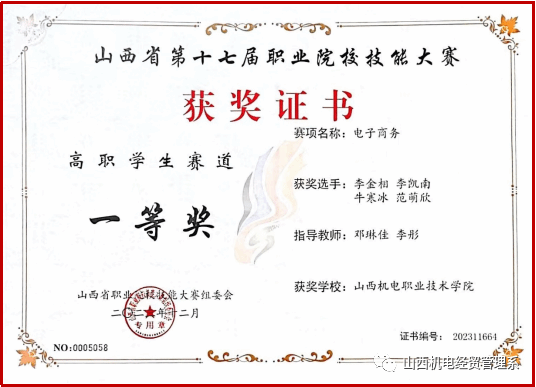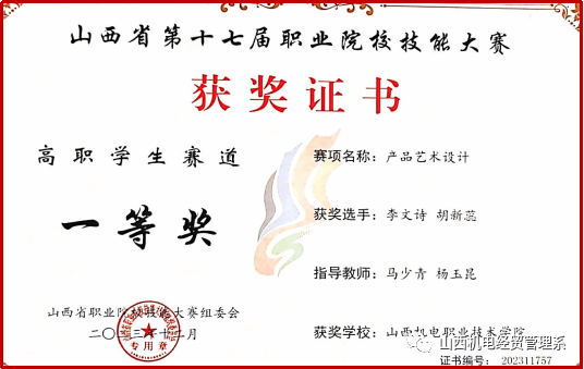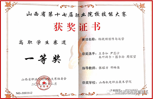 三支学生代表队分别荣获电子商务、短视频创作与运营、产品艺术设计赛项一等奖,毛洁老师荣获商务数据分析教师赛一等奖。其中,在电子商务技能赛项中,一届又一届学生代表队连续六年夺得一等奖;短视频创作与运营、产品艺术设计赛项的一等奖队伍将代表山西省参加2024年国赛。