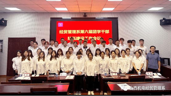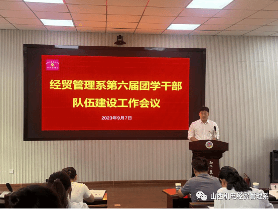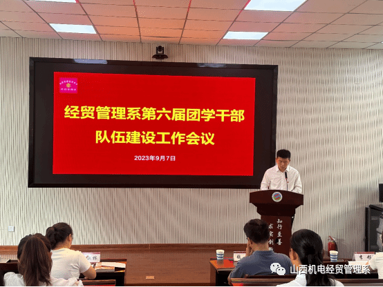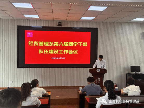 9月7日下午,经贸管理系在学院知行报告厅召开第六届团学干部队伍建设工作会议。经贸管理系党总支书记张冲老师、党总支副书记刘淑林老师、分团委书记李彤老师、分团委副书记王艾、学生会主席团成员靳银银、陈佳乐出席会议,经贸管理系第五届全体团学干部、2022级竞选学生参加会议,会议由靳银银主持。
