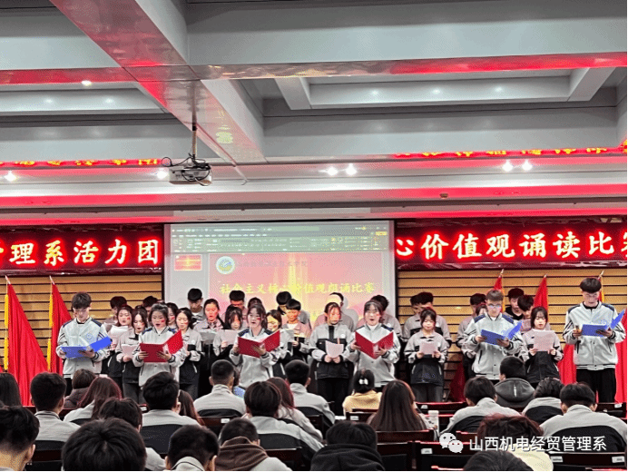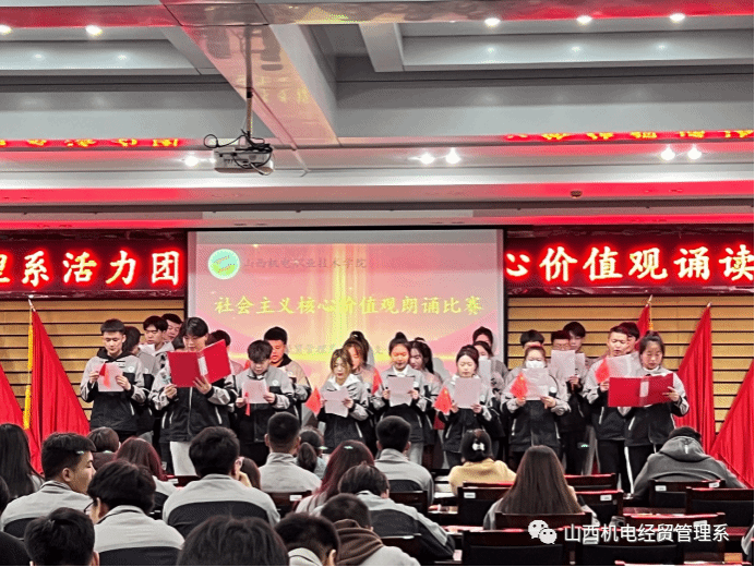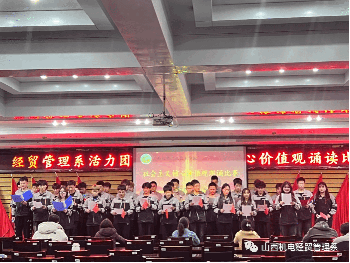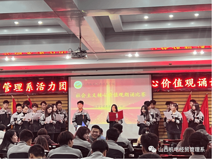 12月7日晚上,经贸管理系在图书馆六层多功能报告厅举办活力团支部社会主义核心价值观诵读比赛。出席本次比赛的评委有经贸管理系党总支副书记刘淑林、分团委书记李彤、辅导员张崇、分团委副书记刘鑫鑫、分团委组织部负责人李玉涛。活动由组织委员王瀚可主持。