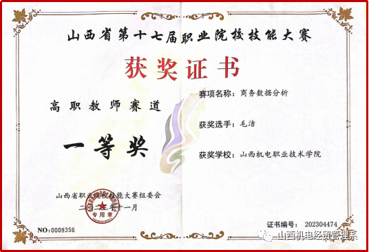 三支学生代表队分别荣获电子商务、短视频创作与运营、产品艺术设计赛项一等奖,毛洁老师荣获商务数据分析教师赛一等奖。其中,在电子商务技能赛项中,一届又一届学生代表队连续六年夺得一等奖;短视频创作与运营、产品艺术设计赛项的一等奖队伍将代表山西省参加2024年国赛。